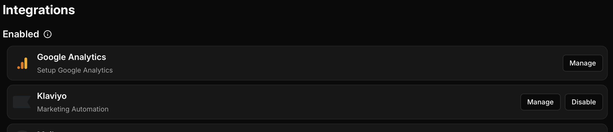 - Enable the Klaviyo integration with the toggle. Then click "Manage"